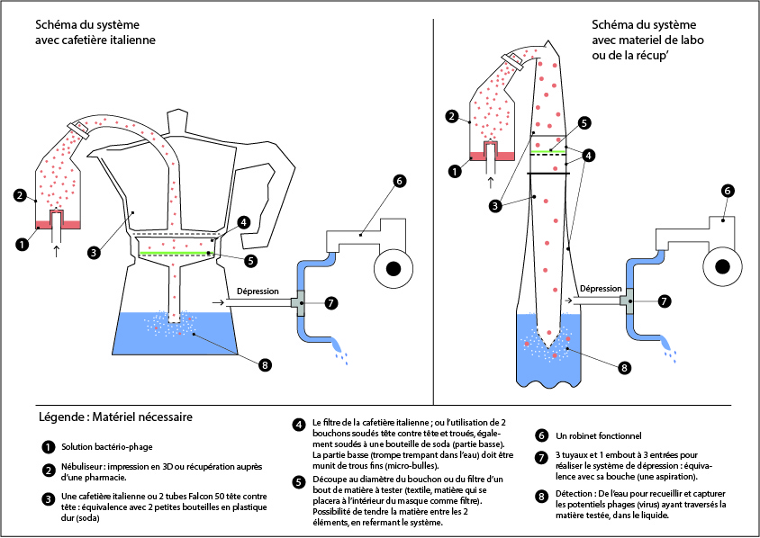Comment prouver que l'on arrive à arrêter les gouttelettes ? Comment les reproduire ? Il serait envisageable de reproduire le virus en utilisant des phages. En les cultivant, puis en les isolant (microbiologie).
